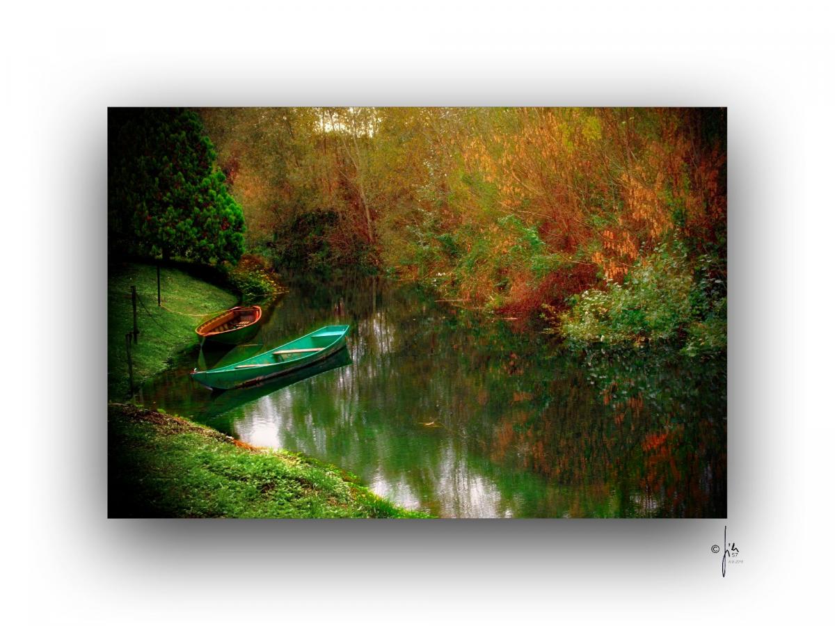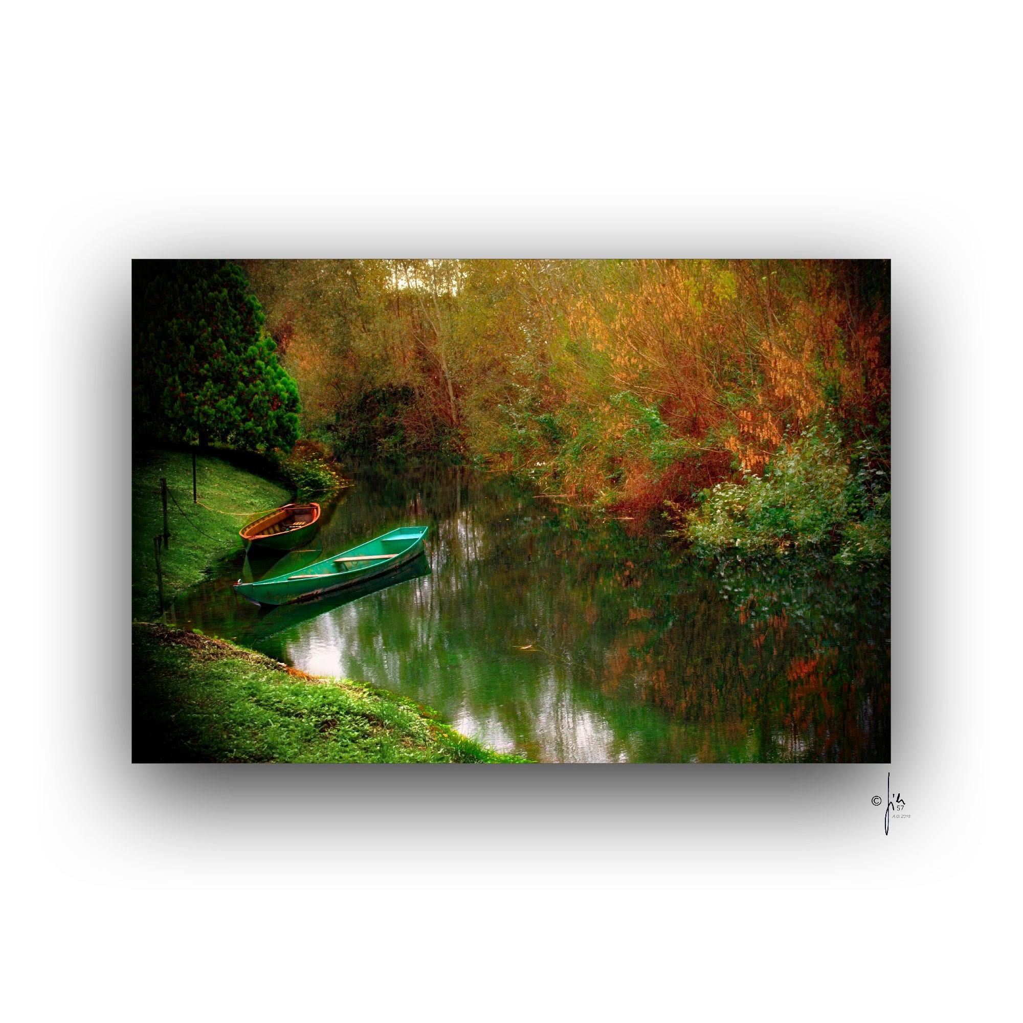 “La quiete di un autunno inoltrato, dove la calma dell’acqua si fonde con i colori caldi della vegetazione circostante.Il riflesso, con le tonalità dorate e rosse, crea un quadro quasi surreale e le due barche ormeggiate sulla riva aggiungono un tocco di malinconia.Un’attesa silenziosa in armonia con la tranquillità del paesaggio che invita alla contemplazione.”