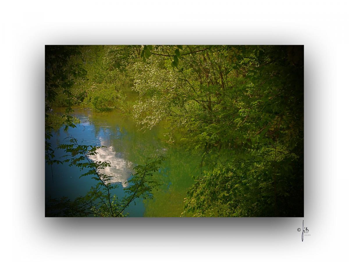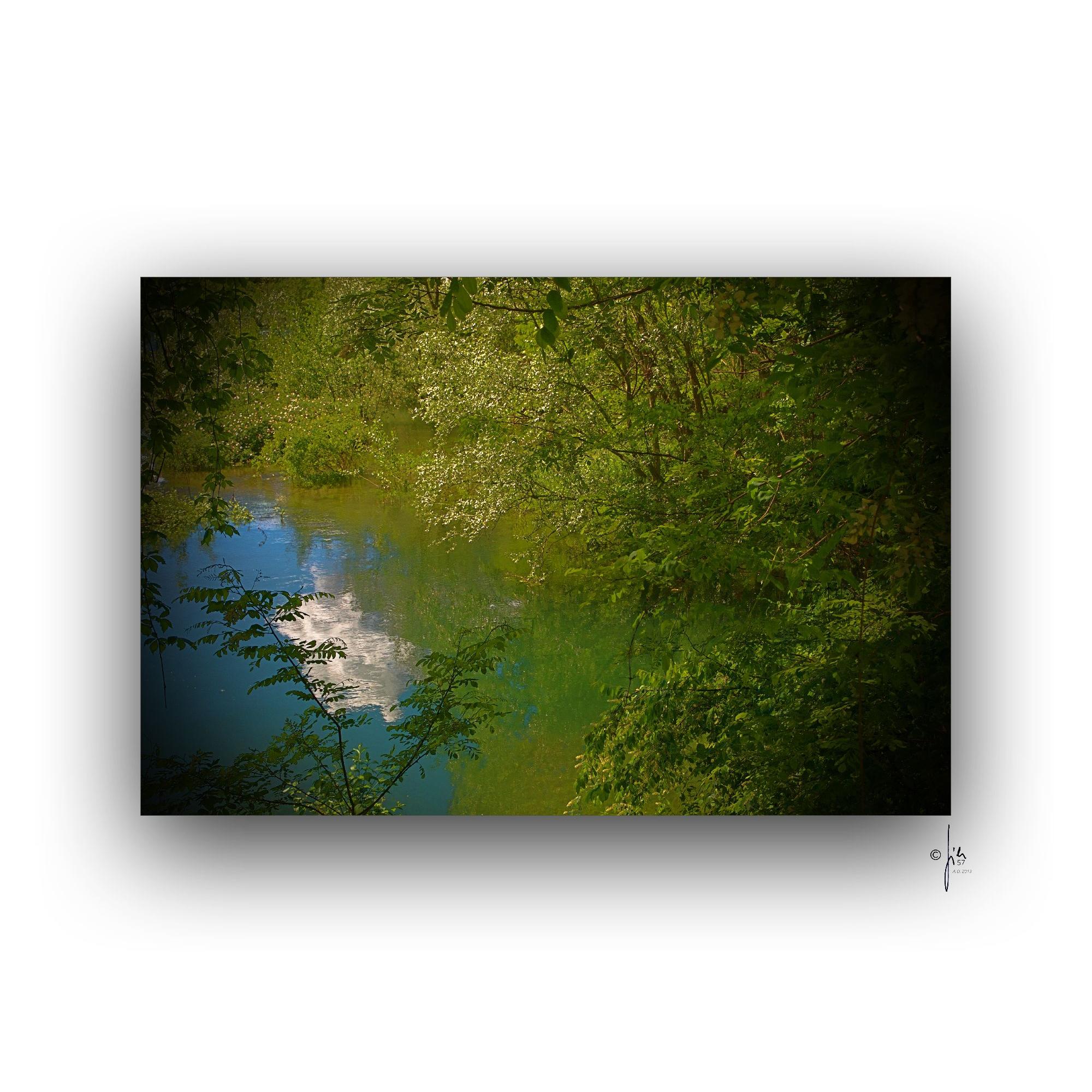 Il cielo limpido che si specchia nelle acque tranquille e la nuvola candida, creano un’atmosfera serena e sognante. Il verde che circonda la scena sembra quasi fondersi, in un’armonia tipica di un’arte preraffaellita, dove ogni dettaglio celebra la bellezza incontaminata e la purezza del paesaggio