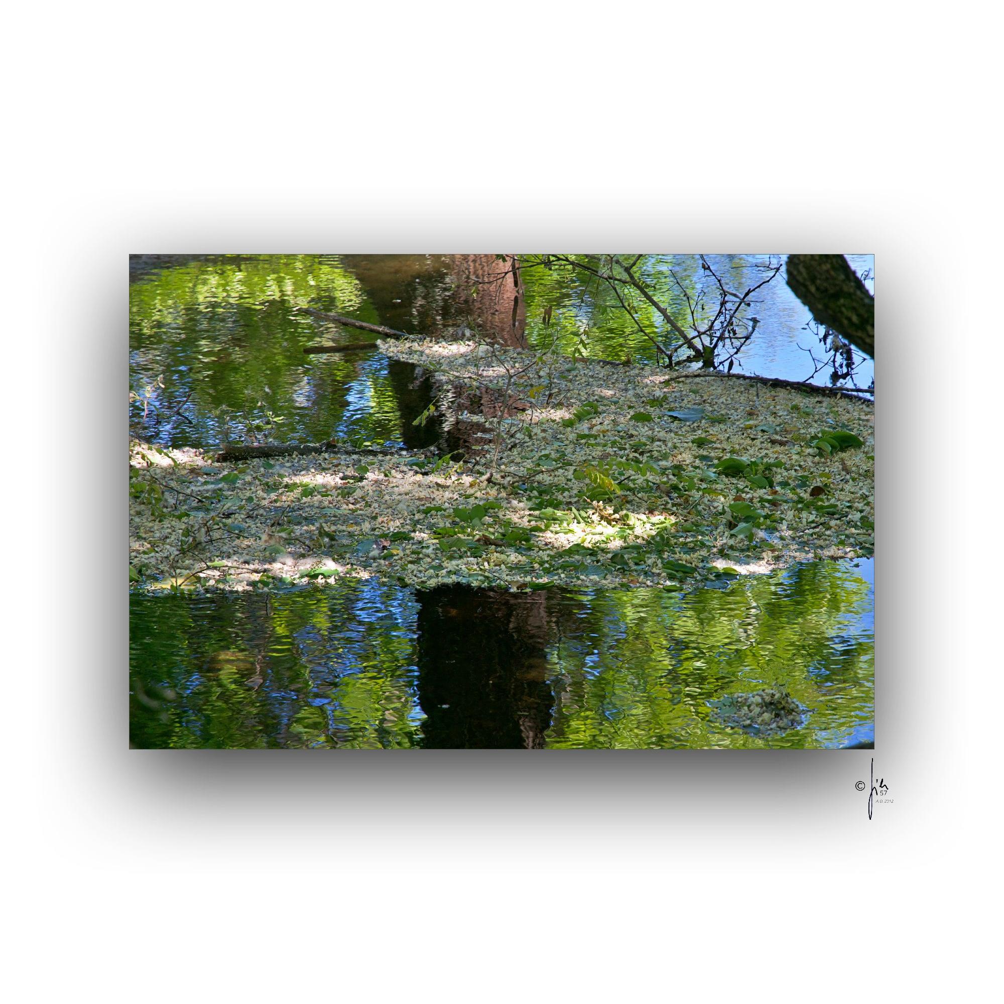 Sull’acqua limpida galleggiano piccoli fiori d’acacia, come stelle cadute dal cielo verde delle fronde sopra di loro. Ogni petalo riflette la luce e danza sulla superficie, in un abbraccio silenzioso con il loro albero, come un ultimo saluto alla primavera