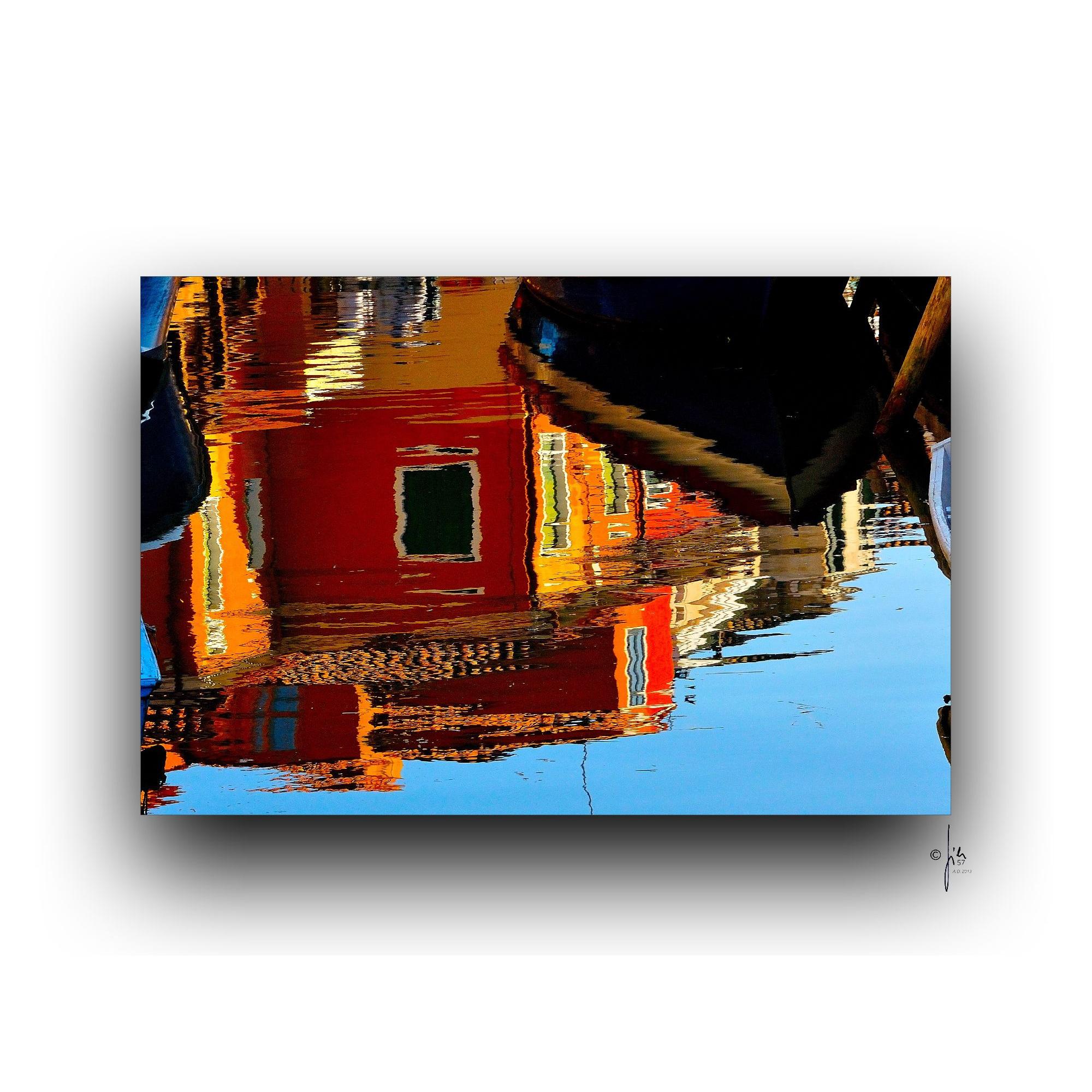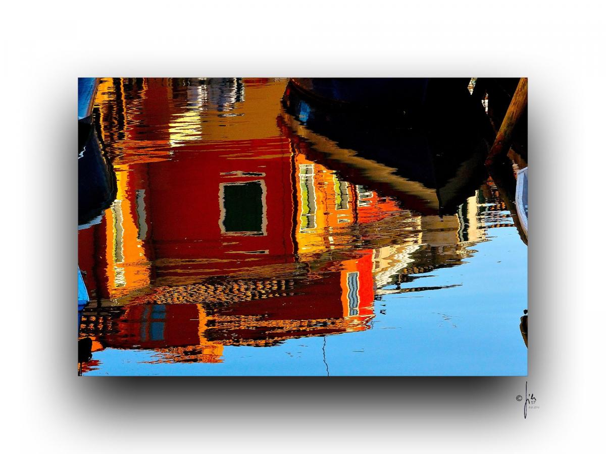 Un riflesso che raddoppia la magia di Burano. Il rosso della casa si fonde con l’acqua del canale creando un quadro vivo e vibrante. L’azzurro intenso del cielo amplifica ogni tonalità, creando un gioco di luci e ombre unico in laguna. Poesia tra acqua e cielo.