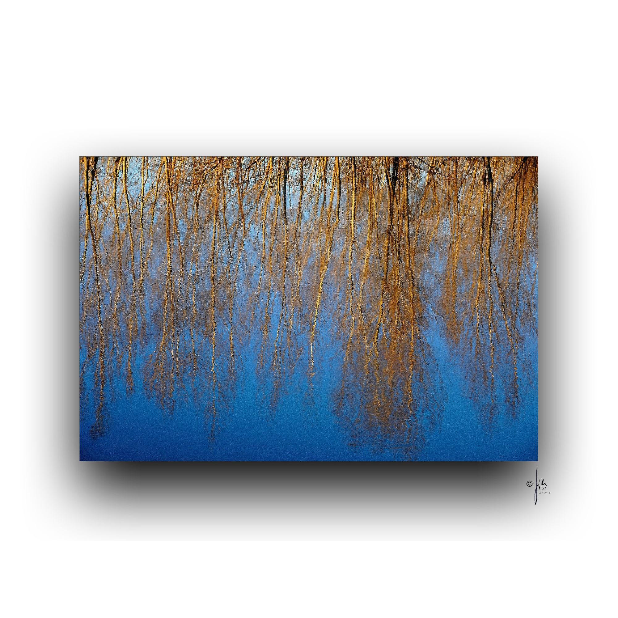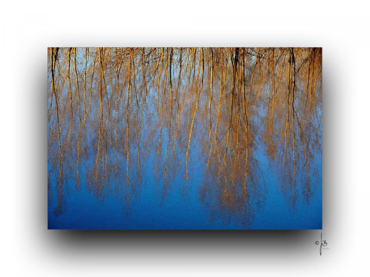 Il cielo si unisce all’acqua in un riflesso incantato, mentre gli alberi spogli danzano lievi sulla superficie, seguendo il movimento delicato della corrente. Sembra quasi che un soffio di vento invisibile porti con sé l’armonia di questo istante sospeso