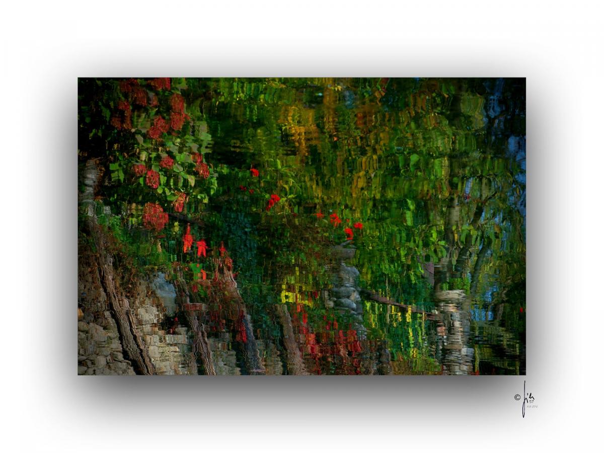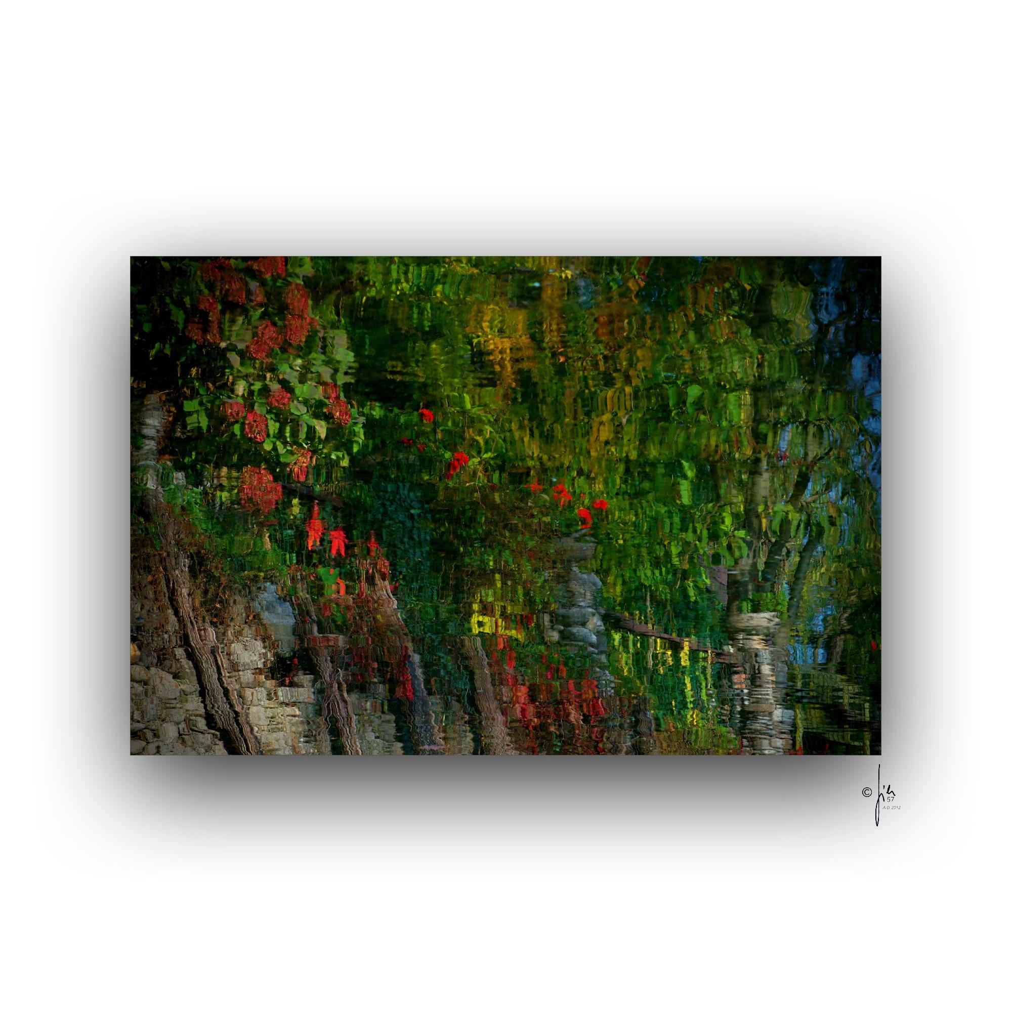 L’acqua scorre leggera e nei suoi riflessi il mondo si trasforma. I fiori, gli oggetti, tutto vibra e ondeggia in una danza silenziosa dove le forme perdono i contorni e i colori si mescolano in un abbraccio di luce. Ogni dettaglio, riflesso in quel velo trasparente, sembra appartenere a un sogno, dove la realtà si dissolve e rinasce come un pensiero che scorre tra le pieghe del tempo.