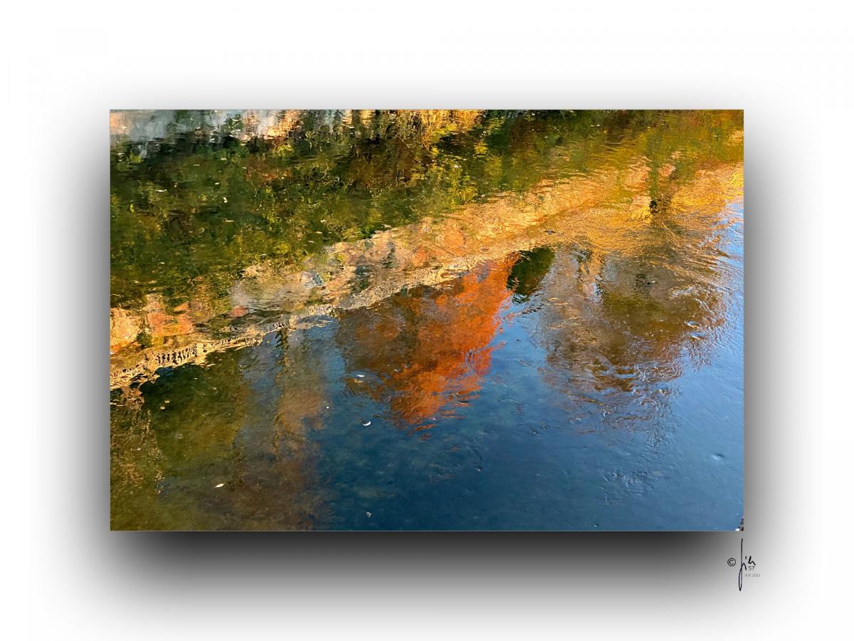 L’acqua che scorre trasporta foglie galleggianti, come pensieri fluttuanti in una danza leggera.Il riflesso di un albero spoglio aggiunge un tocco di malinconica bellezza, simbolo del ciclo della natura