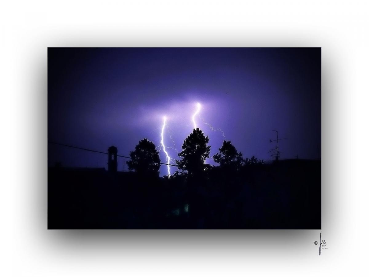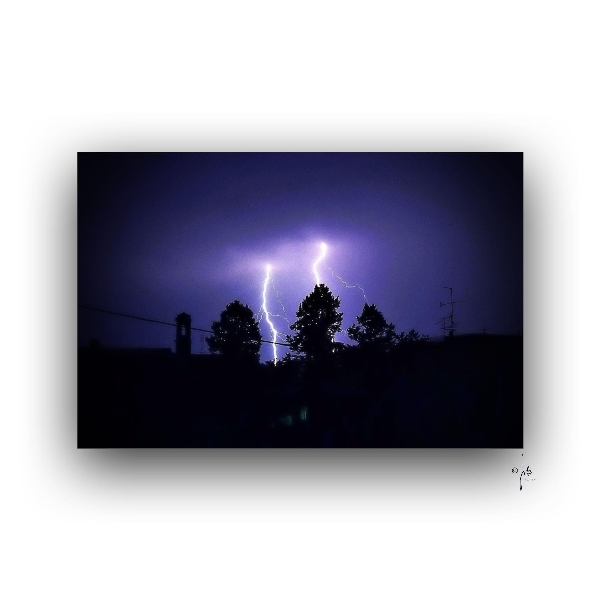 I due fulmini squarciano il cielo, attraversando l’oscurità con una forza primordiale, mentre il campanile della chiesa svetta immobile, quasi a sfidare l’impeto del temporale. E' come se il cieloe la terra dialogassero in un linguaggio antico: la furia e la calma, la forza divina e quella naturale si incontrano in un istante di pura energia.