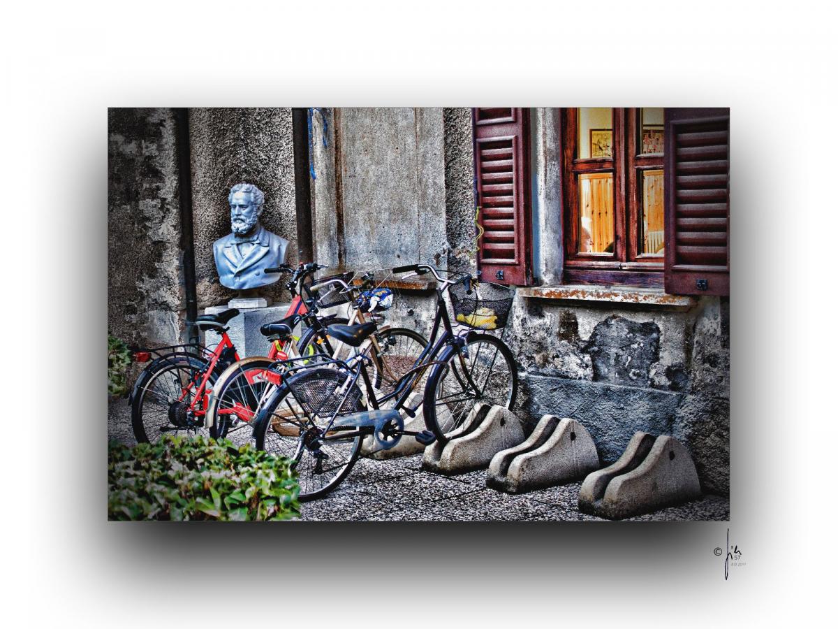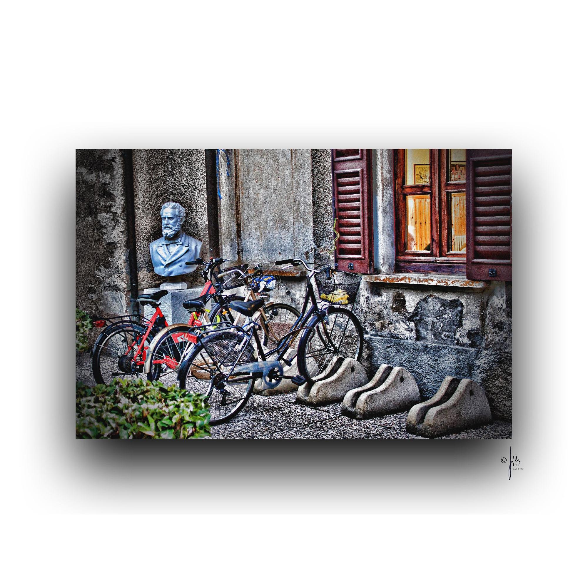 La finestra illuminata sembra raccontare storie di vita che si svolgono dietro quelle mura scrostate, dove il tempo ha lasciato il segno. Le biciclette appoggiate al muro e l’erma del personaggio locale ci ricordano le radici profonde e l’identità di questo luogo, in bilico tra passato e presente.
